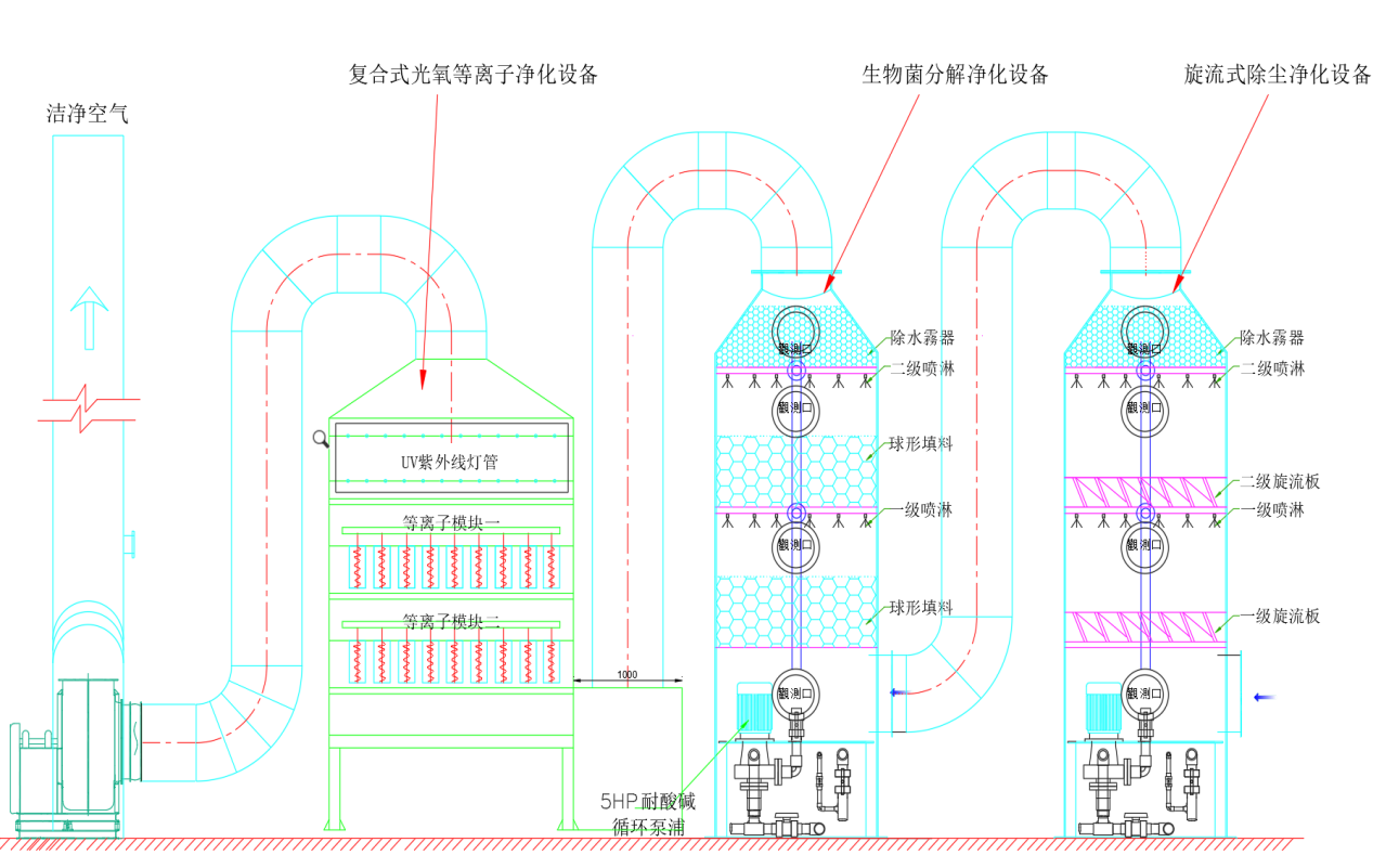 塑料造粒廢氣——>風(fēng)管收集——>旋流噴淋塔——>生物噴淋塔——> 等離子光氧一體機(jī)——>風(fēng)機(jī)—>達(dá)標(biāo)高空排放