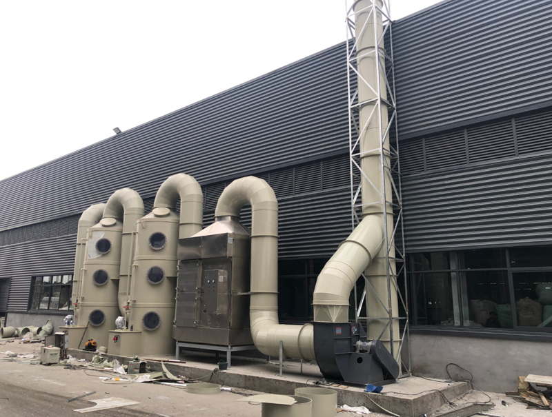 造粒工序產(chǎn)生的氣體和煙霧,由集氣裝置對(duì)其進(jìn)行收集后輸送到旋流噴淋塔——生物噴淋塔——等離子光氧一體機(jī),進(jìn)行凈化處理后經(jīng)排氣筒高空排放。